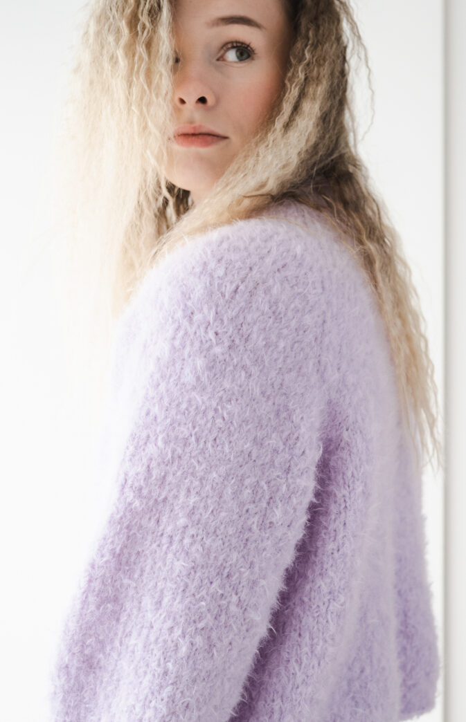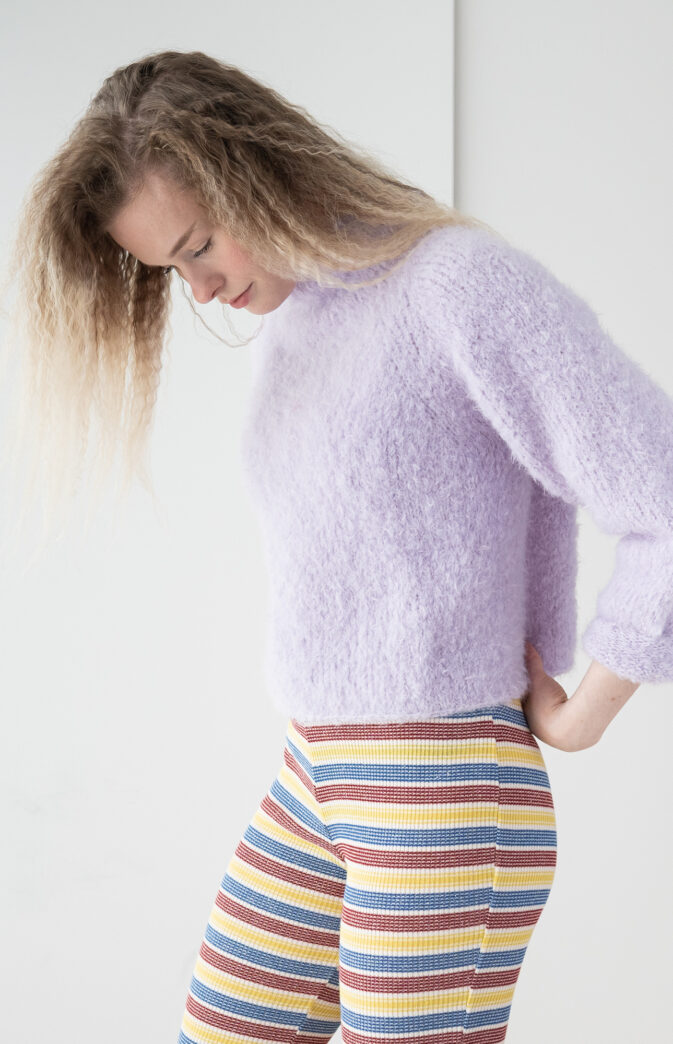 Brede raglanmasker. Lang hals som kan brettes dobbel om ønskelig. Genseren er cropped og litt vid – noe som gjør at den passer både til jeans og kjoler.
