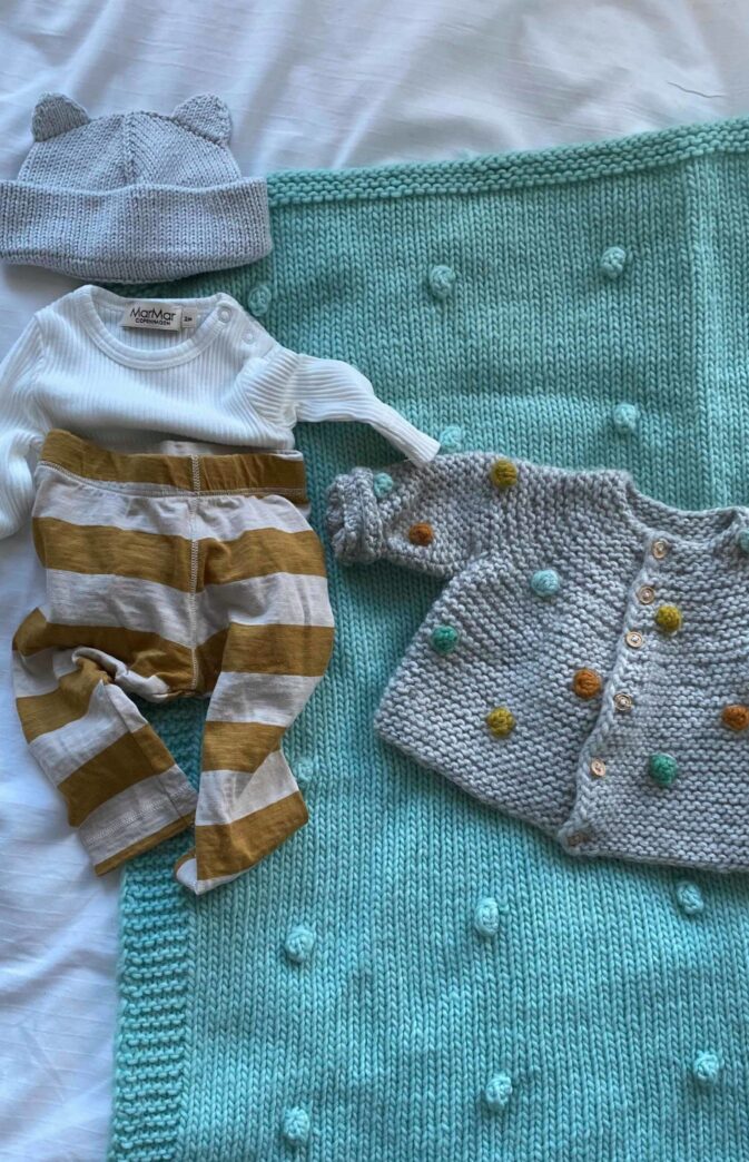 Avbildet i "Foggy Light grey" Hip Wool. Popcorn i farger: "Modest mint", "Sweet caramel brown", "Honey dream" og "Meadow green" på nyfødt baby, str 0-3 måneder.