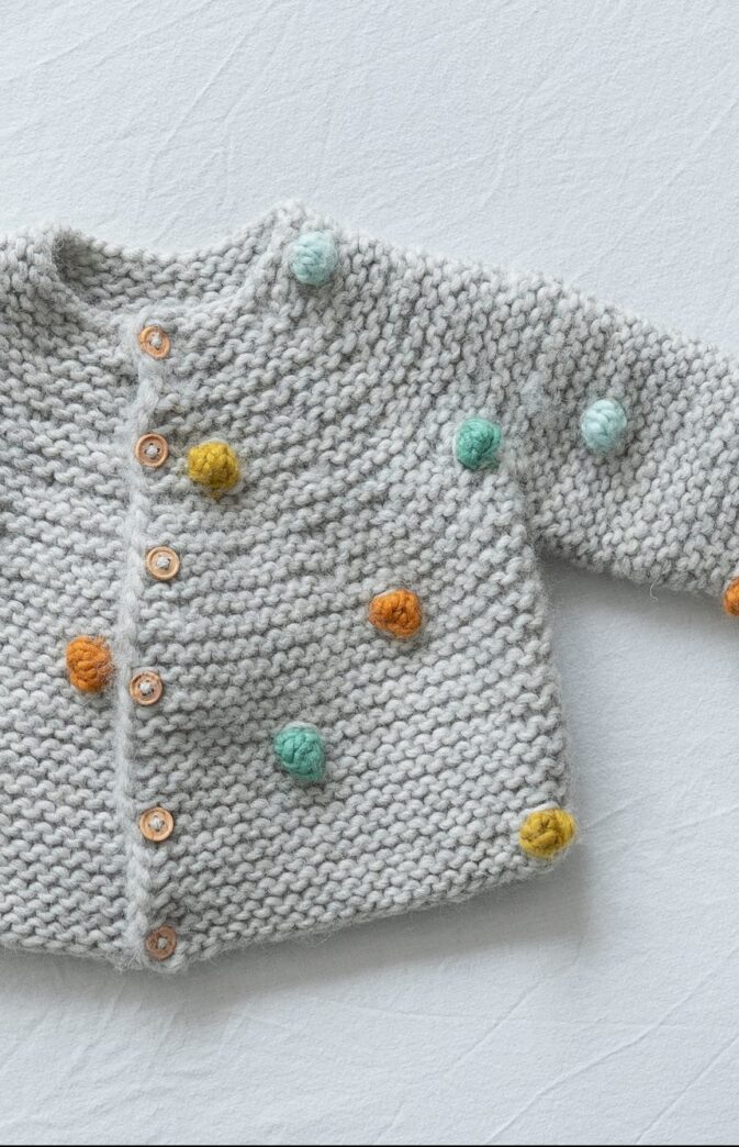Strikkes ovenfra og ned med små popcorn, boblestrikk. Myke og små, kjennes ikke igjennom jakken, som dermed er behagelig også for de små å bruke.
