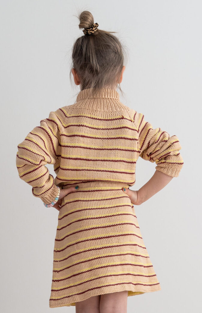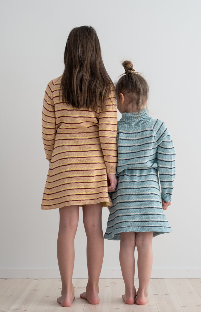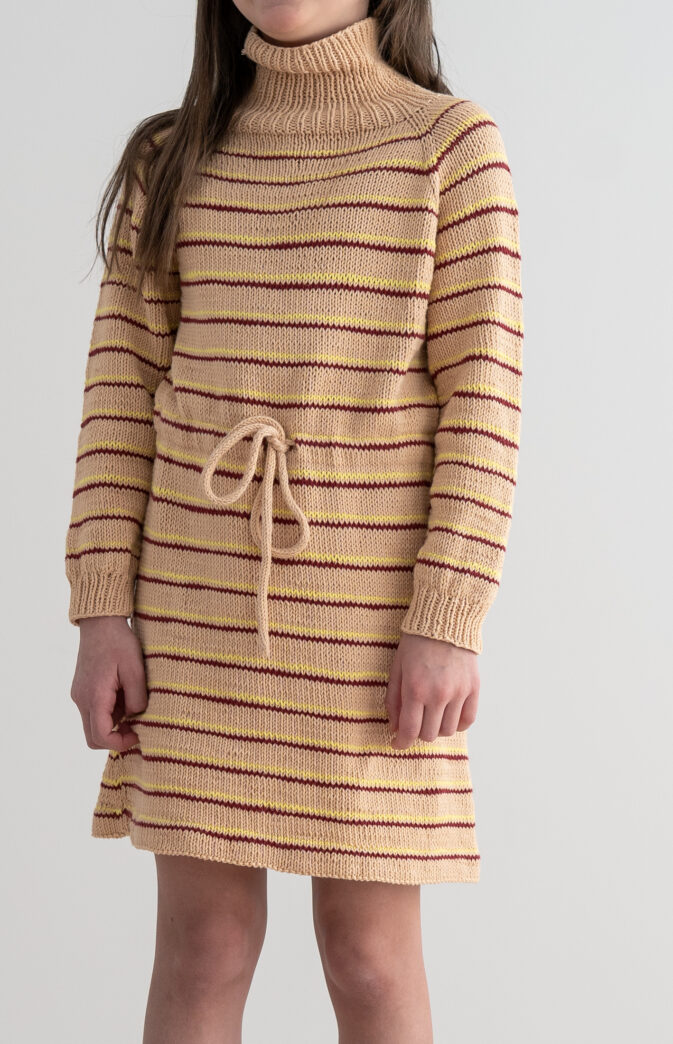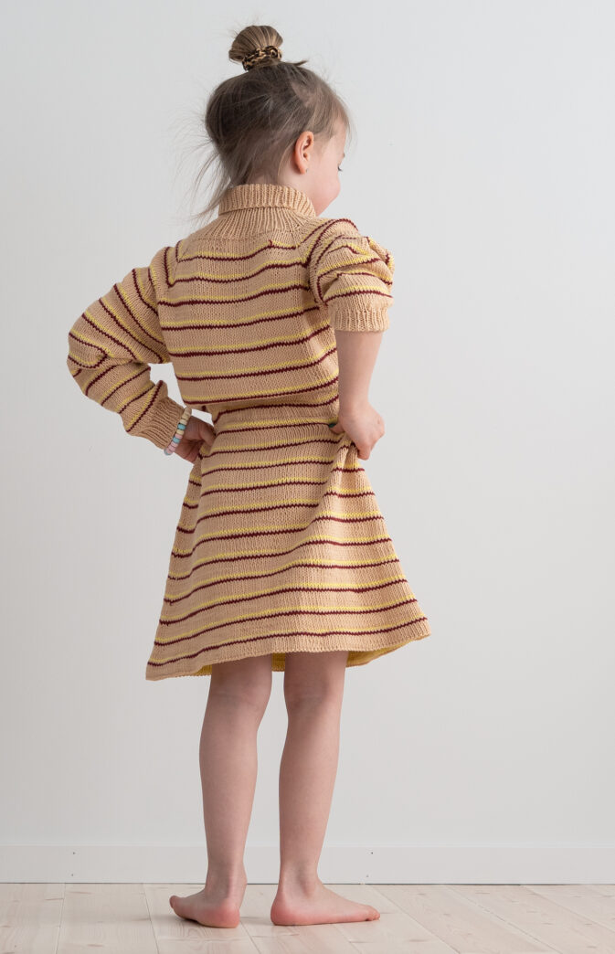 Strikkeoppskrift på kjole i bomull til jente. Myk og gøy stripete kjole med høy hals for barn!