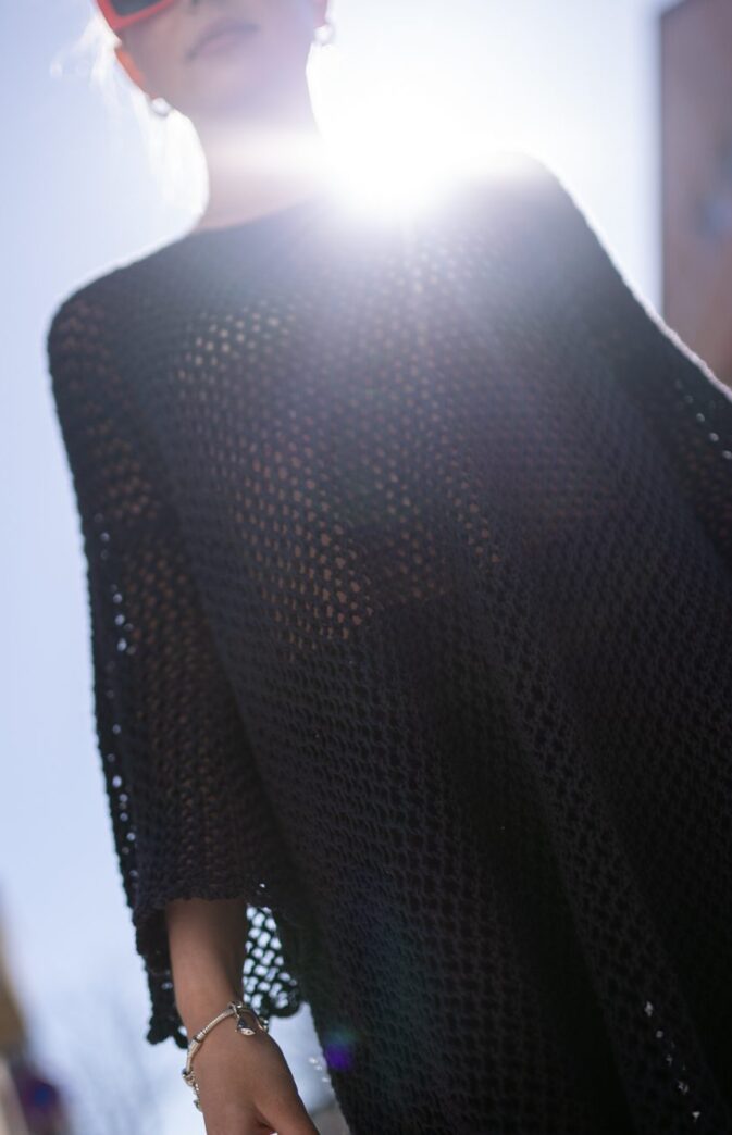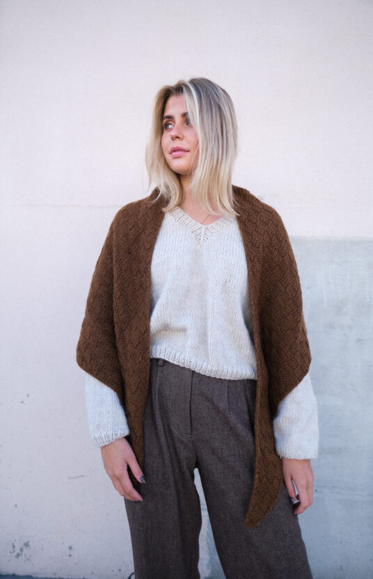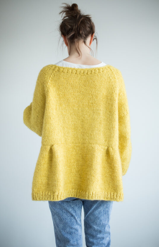 Passformen er vid og kort. Halsåpning noe vid, ermer med sleng. Lett å tilpasse lengde da den strikkes ovenfra og ned.
