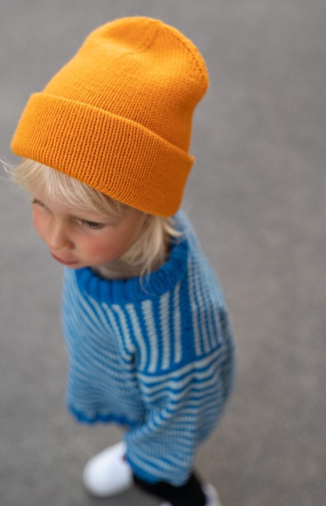 Enkel glattstrikket lue til barn. Strikkes nedenfra og opp i vår myke POP merino. Ønsker du et fint strykemerke som på avbildet modell se under «Tilbehør og Utstyr».
