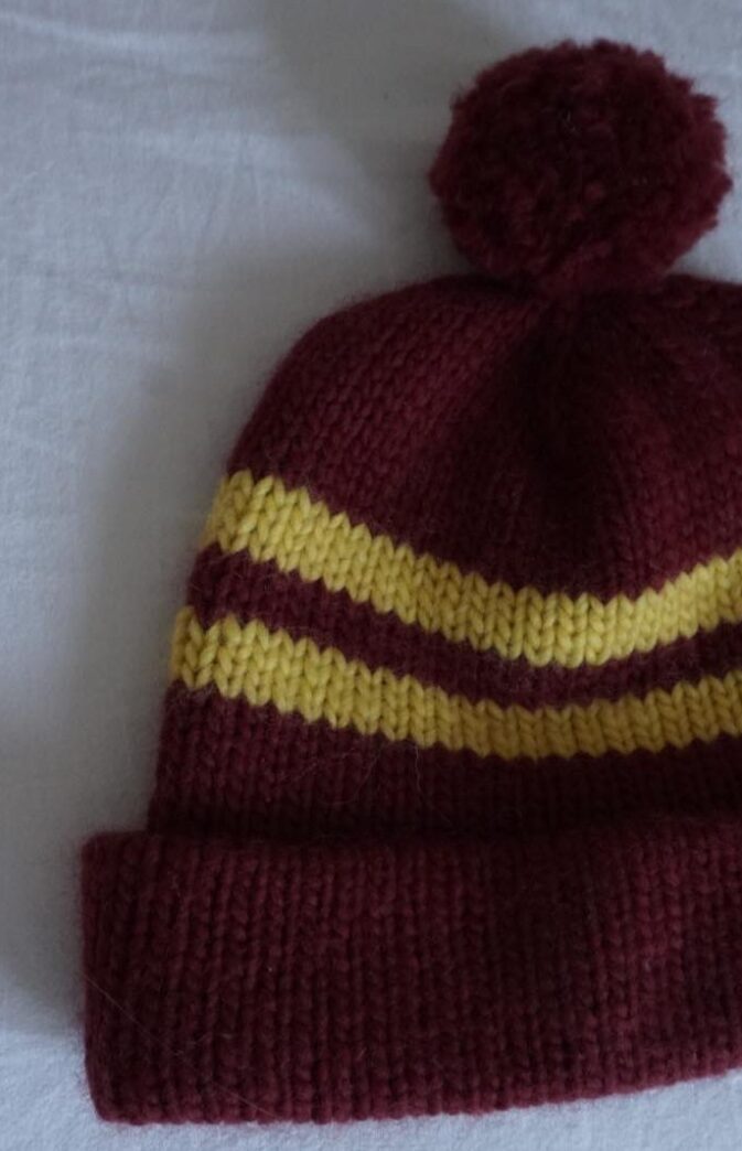 Digg lue som sett i Harry Potter filmene. Strikk den i husfargene til Harry og Griffindor som her, eller velg din favoritt.