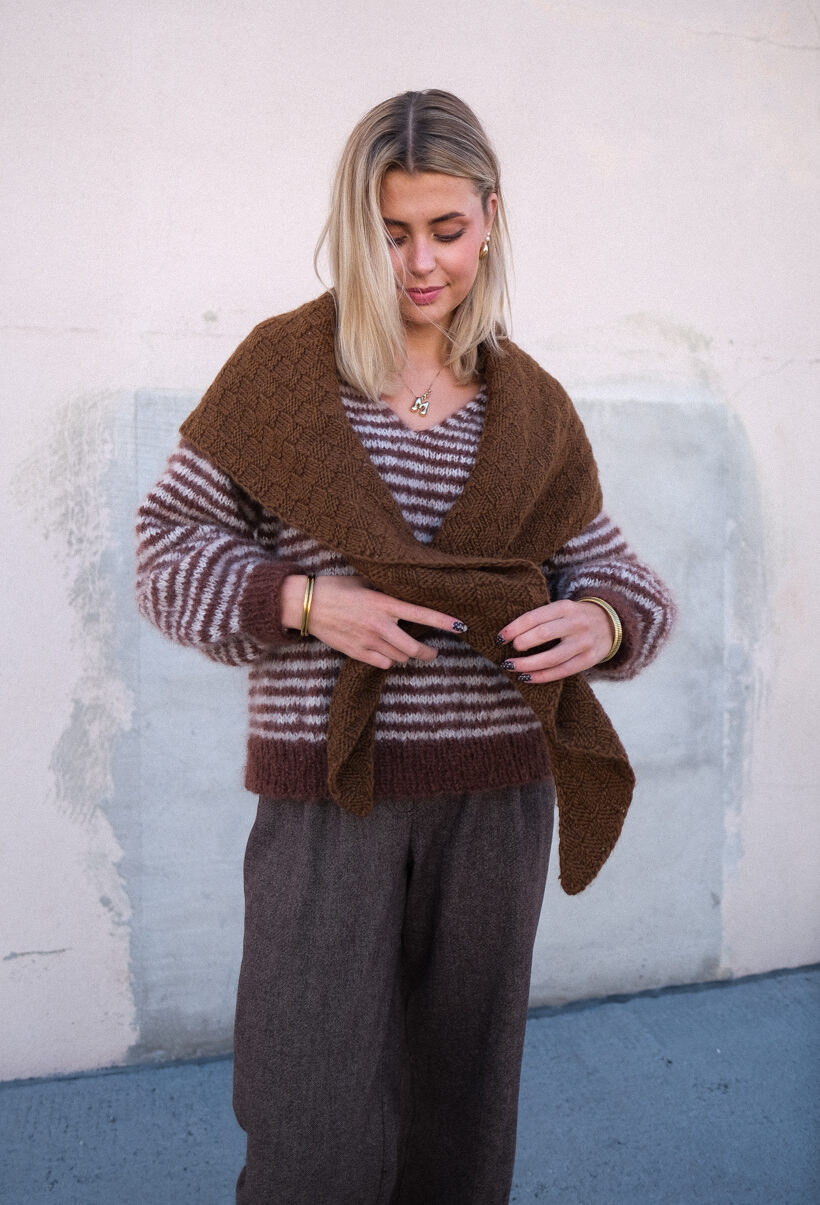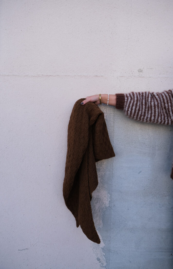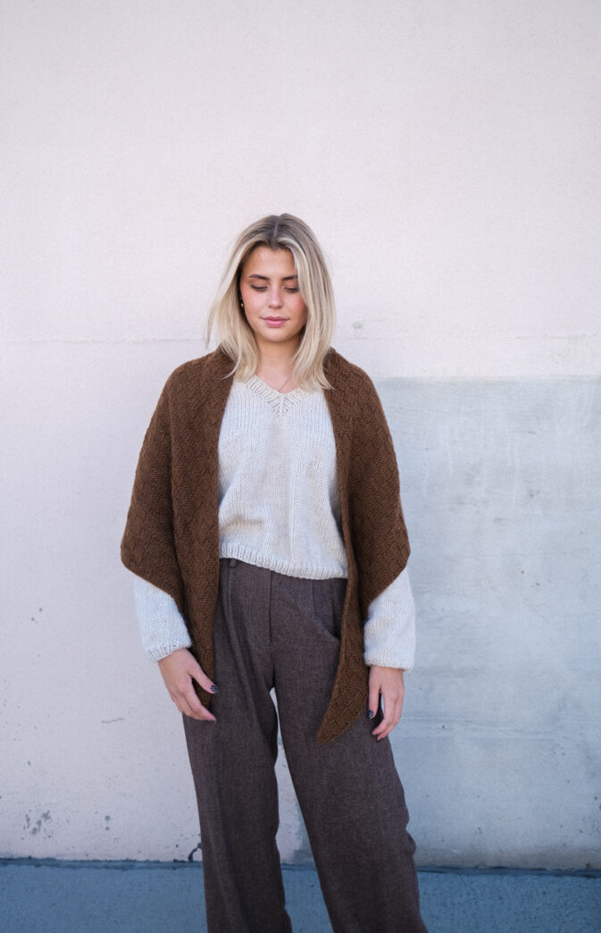 Strikkeoppskrift digg trekantskjeff / sjal med enkel struktur. Deilig og varmt sjal strikket i Hip Wool. Hele sjalet strikkes i rutediagram, og oppskriften gir detaljert beskrivelse på hvordan du starter slik at mønsterdiagrammet viser seg tydelig. Du kan enkelt justere størrelsen på sjalet ved å strikke kortere/lengre enn beskrevet i oppskrift.