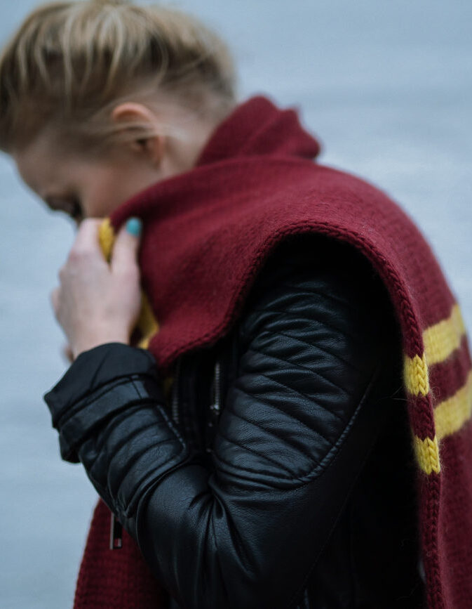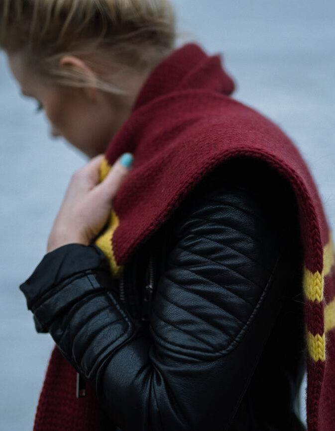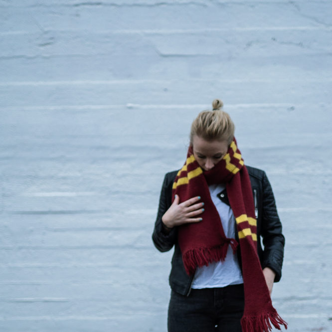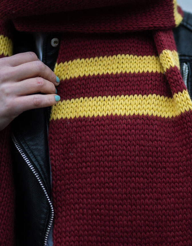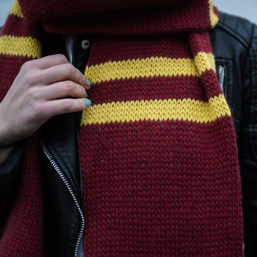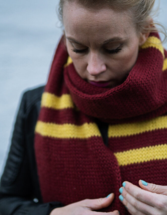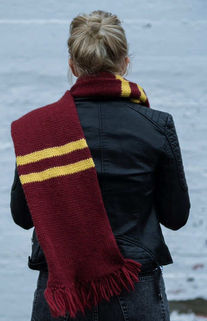 Det berømte Harry Potter skjerfet, i Gryffindor farger. Et langt mykt skjerf strikket rundt i glattstrikk. Perfekt for nybegynnere. Lag det med frynser eller uten for et enklere uttrykk. Velg gjerne farger fra ditt favoritthus på Galtvort.