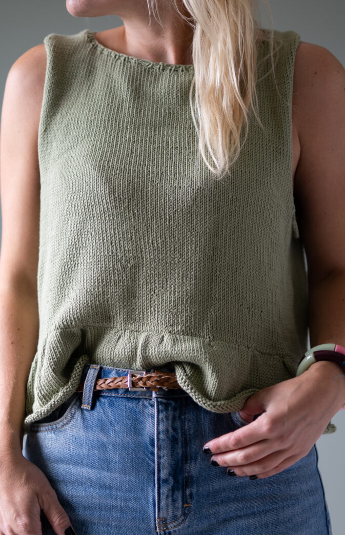Nydelig og feminin strikket topp med volang nederst på bolen. Behagelig og løs passform. Toppen strikkes nedenfra og opp i vårt myke bomullsgarn.
