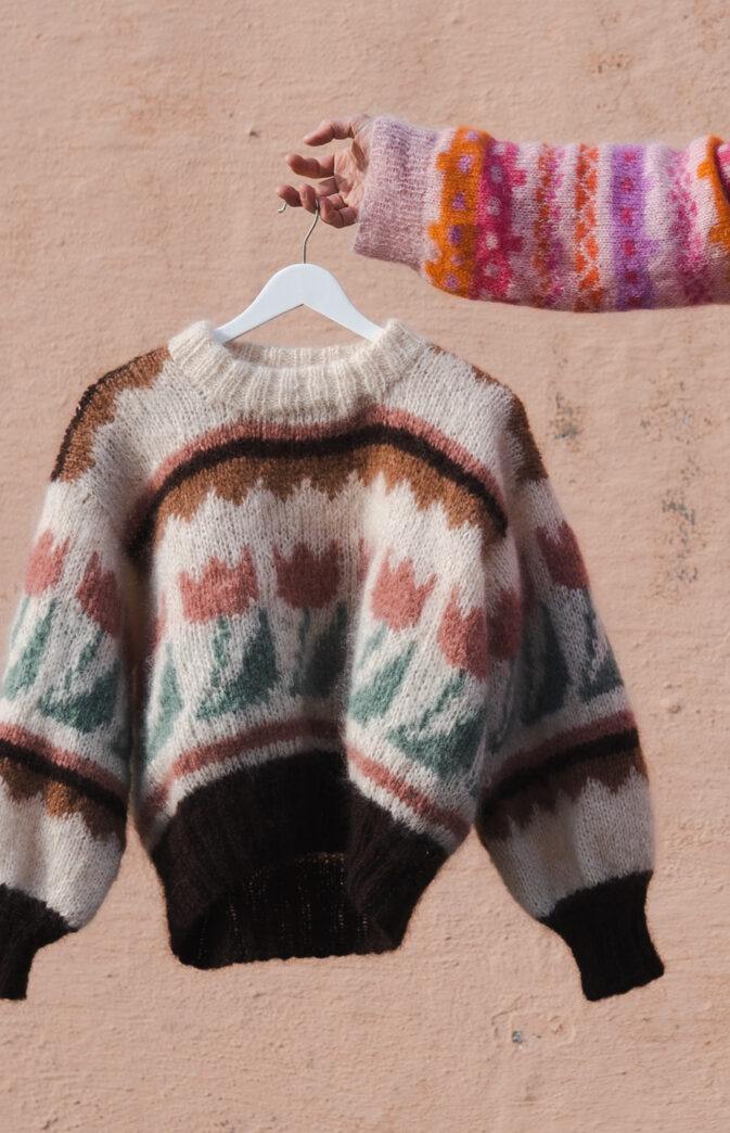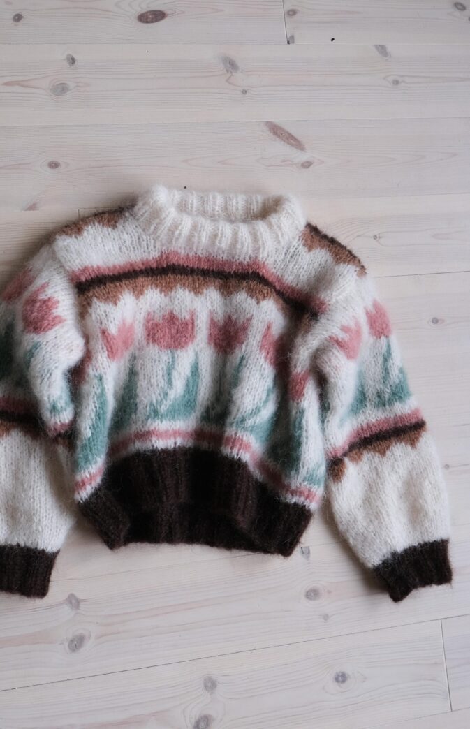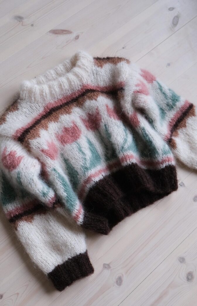 Strikkeoppskift 80talls tulipan genser. En HipKnit klassiker som finnes i ulike varianter. Denne er strikket opp i litt mindre mønster og en rad tulipaner. Se gjerne våre andre varianter.
