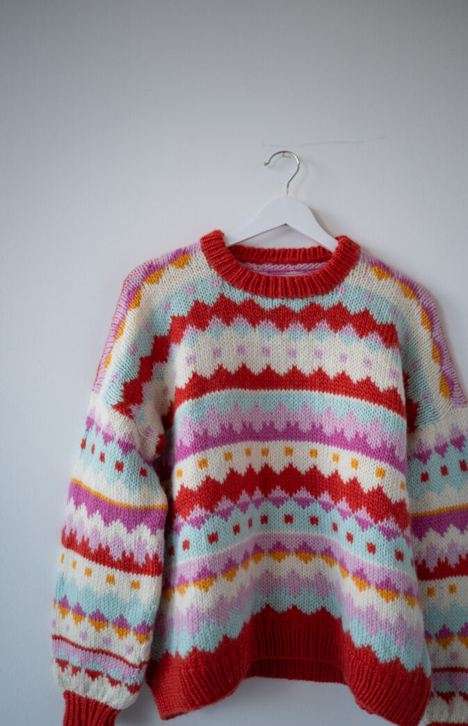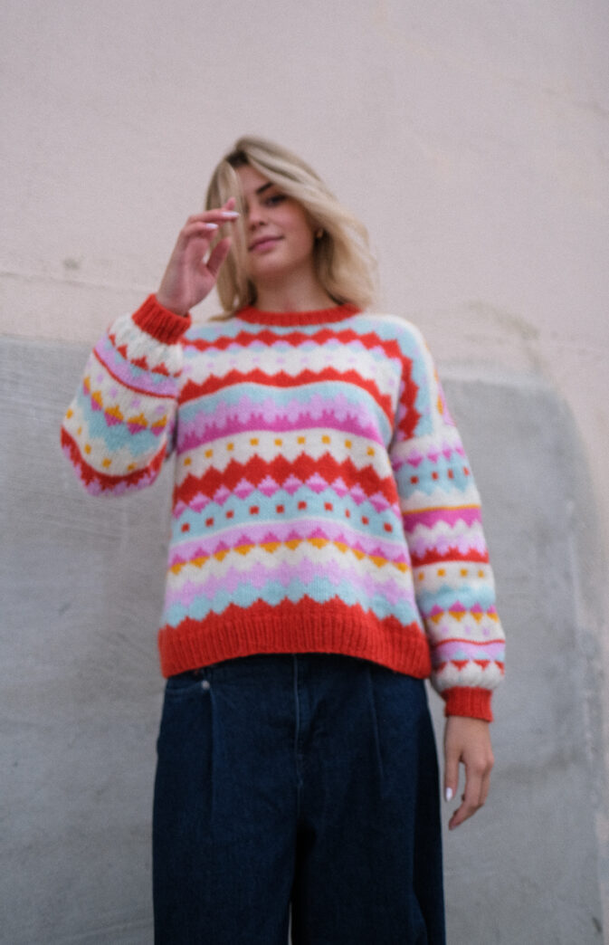 Strikkeoppskrift på mønstergenser i myke Hip Wool. Genseren har et enkelt mønsterdiagram med fokus på farger og fargebytte-perfekt for nybegynnere på flerfarget strikk.