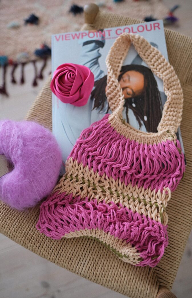 Strikkeveske oppskrift. Kul sommerveske i deilige bomull, strikket i to tråder og forskjellige farger. Kan strikkes ensfarget . Vesken strikkes i 4 separate stykker som senere monteres sammen. Til slutt strikkes håndtakene i rettstrikk og sys fast i vesken.