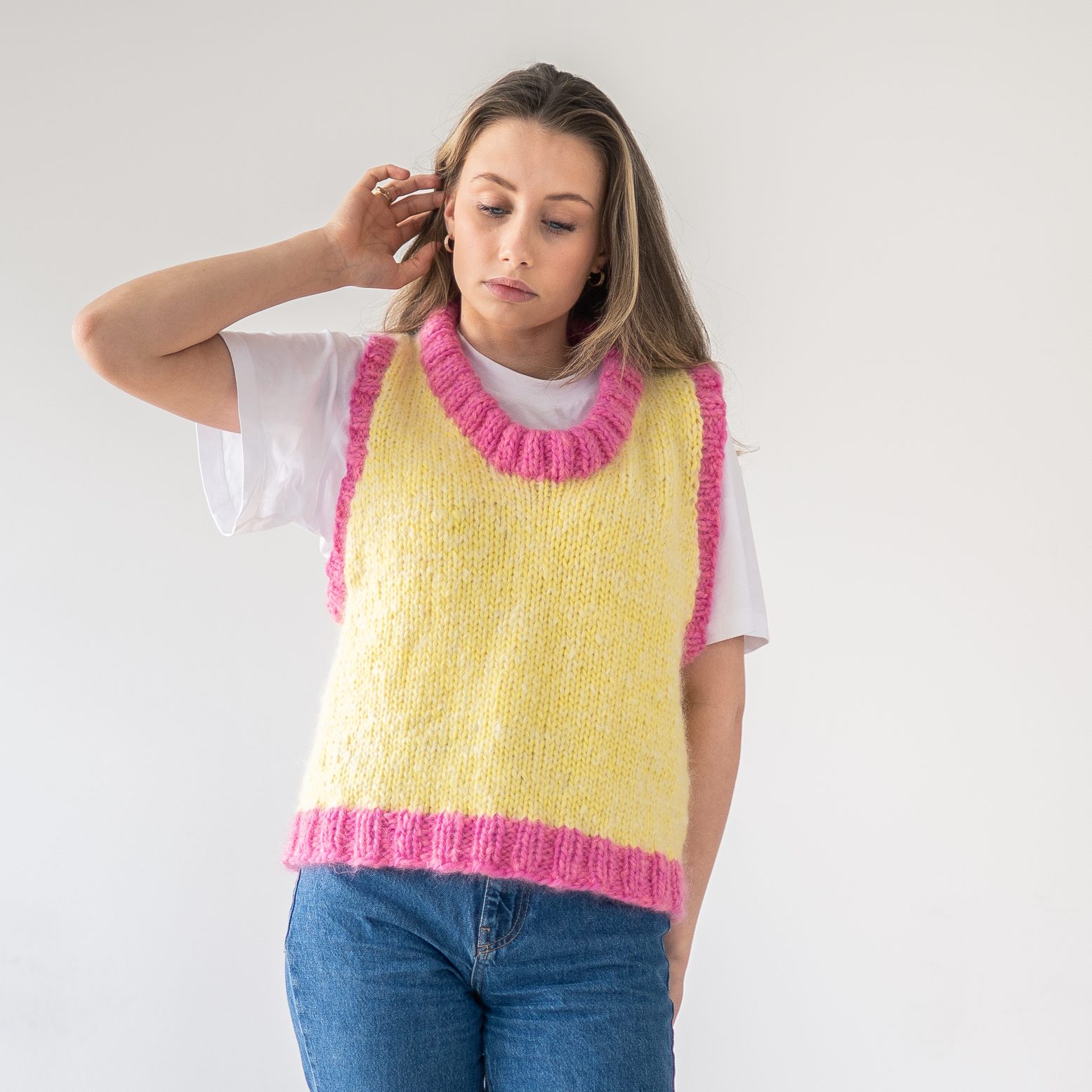 Gul versjon "Summer Vibes Yellow" Hip Wool holdt sammen med "Lemonade" Fluff, ribb strikket i "Hubba Bubba Pink" Hip Wool holdt sammen med "Candy Pop Pink" Fluff.