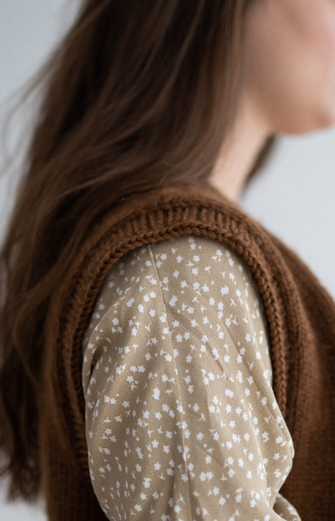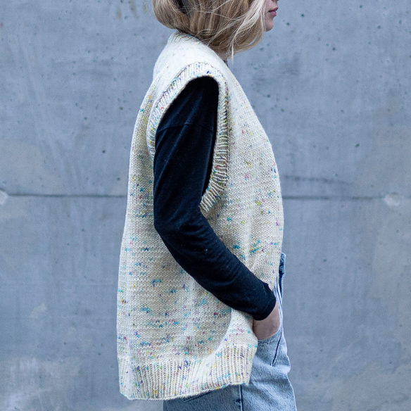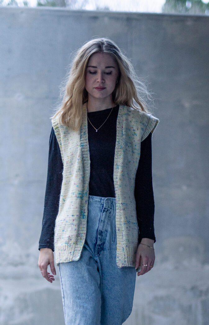 Julia vest – søt klassisk strikkevest til dame. Perfekt vest til skjørt og jeans. Strikk med eller uten lommer.