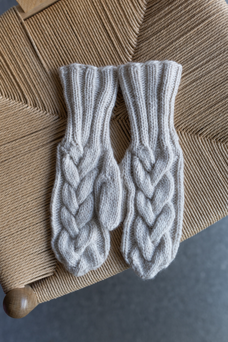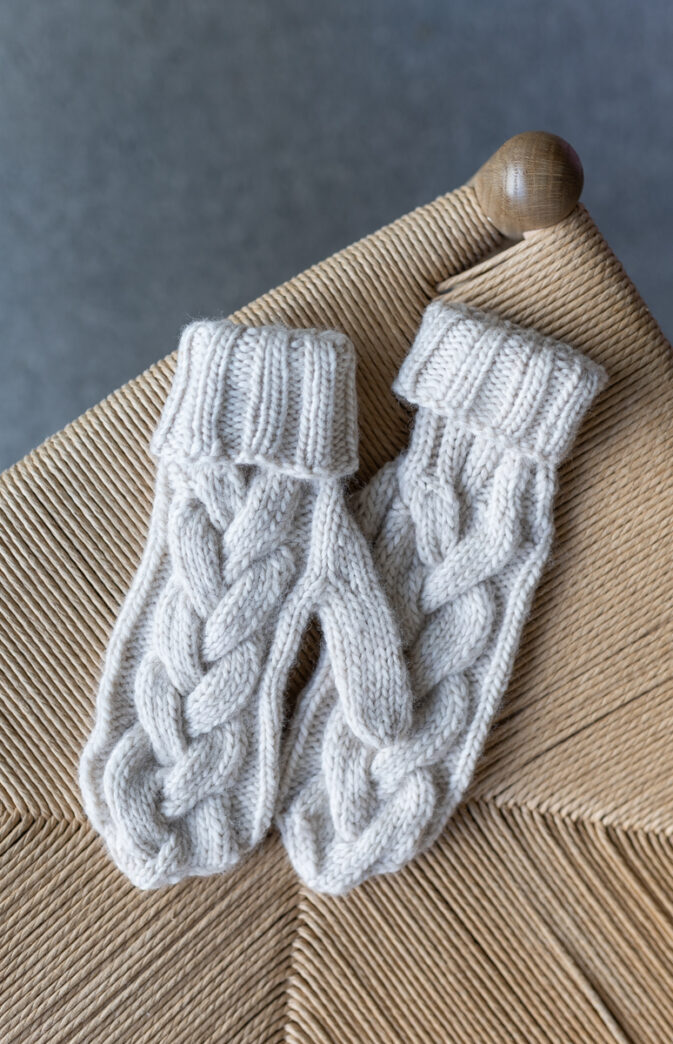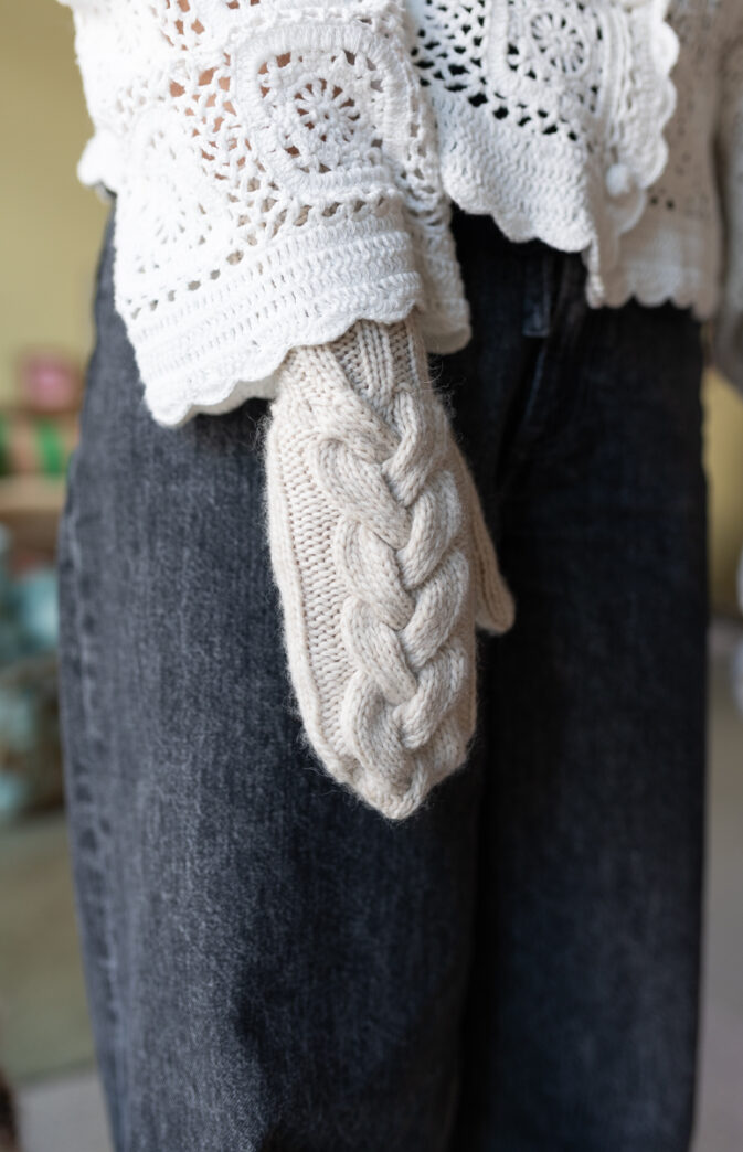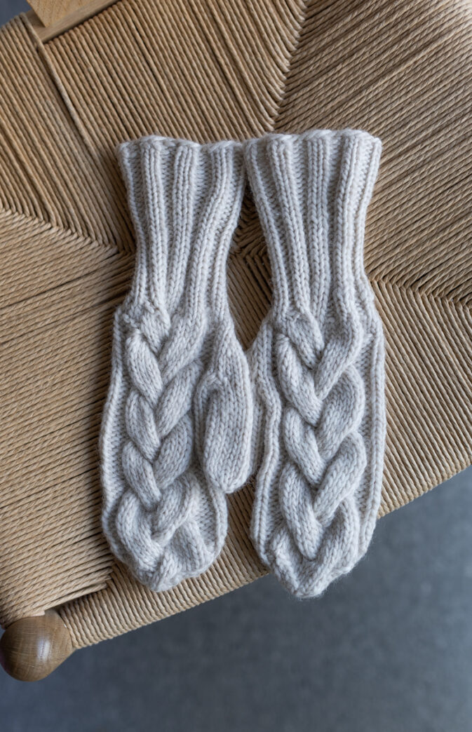 Deilige varme votter i Hip Wool med fin bred flette over hele. Fletten er lik som på vår Alba genser og har derfor fått samme navn.