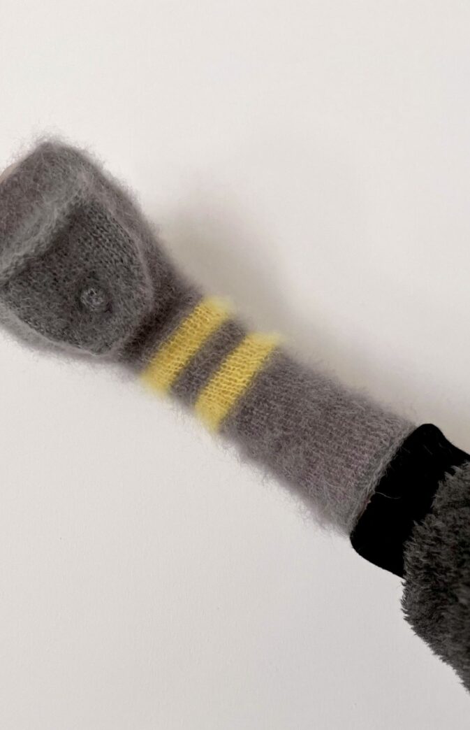 Avbildet i Hip Mohair "Cloudy Grey" og striper "Here Comes The Sun"