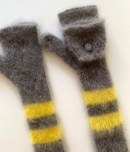 Strikkeoppskrift på lange deilige votter med eller uten flapp. Vottene strikkes nedenfra og opp i glattstrikk med to tråder Hip Mohair holdt sammen. Du velger selv om du ønsker å strikke en enkel versjon uten flapper eller om du ønsker å strikke votten med flapp til fingrene og tommelen.