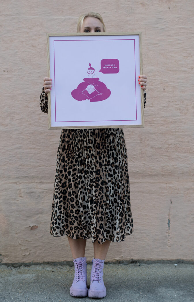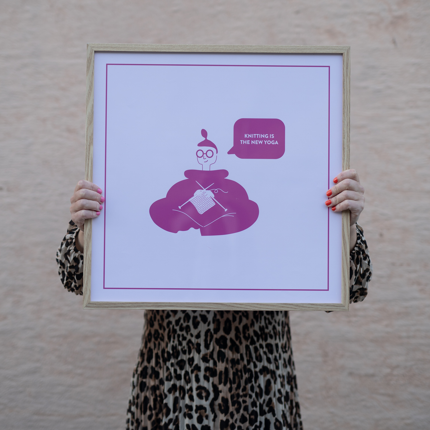 Nydelig moderne poster i fresh farge. Strikkeplakat «Strikking er den nye yoga». Kommer i matt papirkvalitet og printes på bestilling, Leveringstid ca 1 uke.