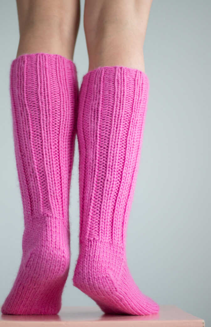 Her har vi strikket dem i merino, en litt tynnere og mer tettsittende versjon enn med Hip wool. Samme strikkeoppskrift som originalen i Hip wool, kun pinnestr som er justert. Ribbestrikk er perfekt når sokker skal passe forskjellige størrelser. Vi elsker våre Raggsokker!