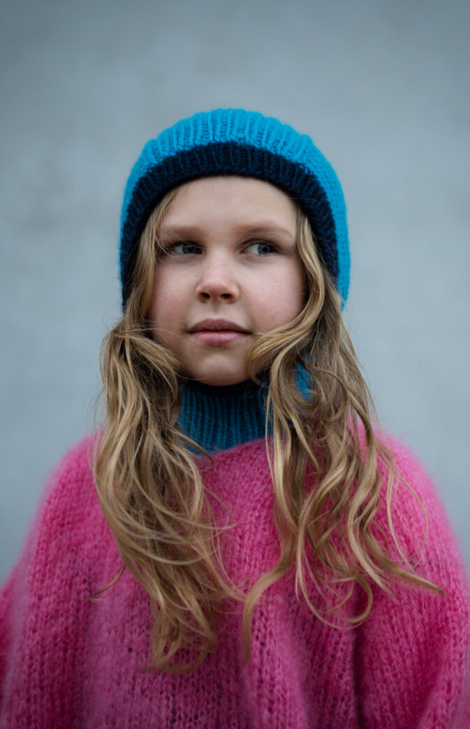 Avbildet versjon er størrelse 4-10 år strikket i Hawaii blue (Utgått farge, Bestfriend blue mest lik) og Midnight mood blue, på jente 10 år.