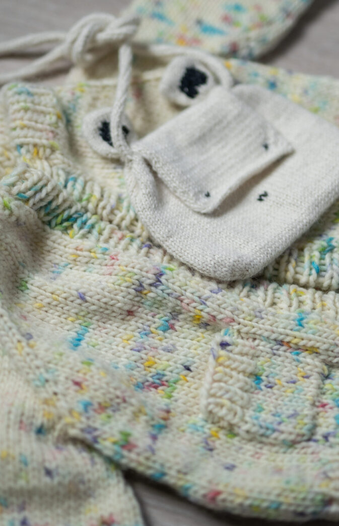 Avbildet er modell iført farge «Blue waves» Hip Wool samt "Tutti frutti" håndfarget Hip Wool garn.