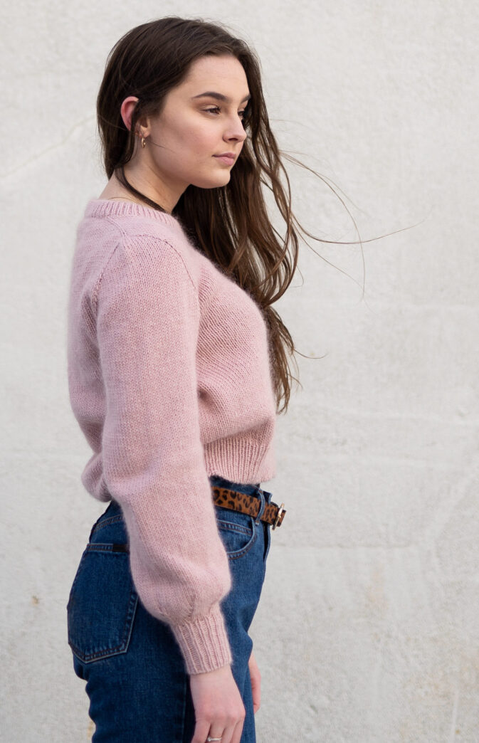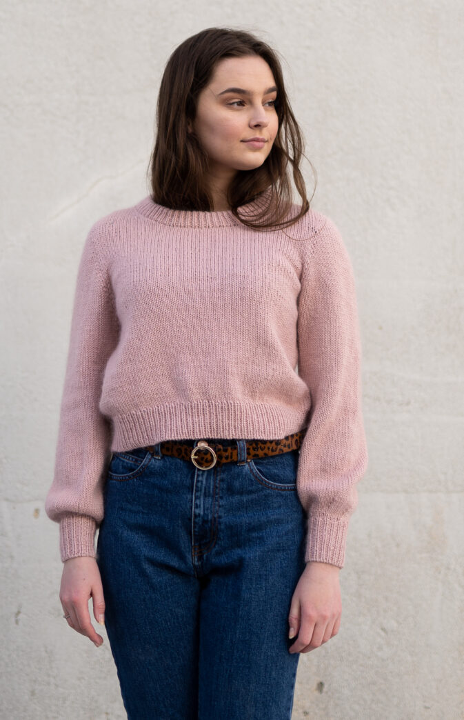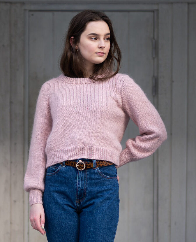 Strikkepakke med garn og gratis digital strikkeoppskrift. Nydelig basic genser med kontinuerlig skulderkonstruksjon som gir en fin passform. Strikket ovenfra og ned i en tråd bomull med en tråd Hip Mohair, monteringsfri. Modell 169 cm i str S i rosa og M i lys gul.