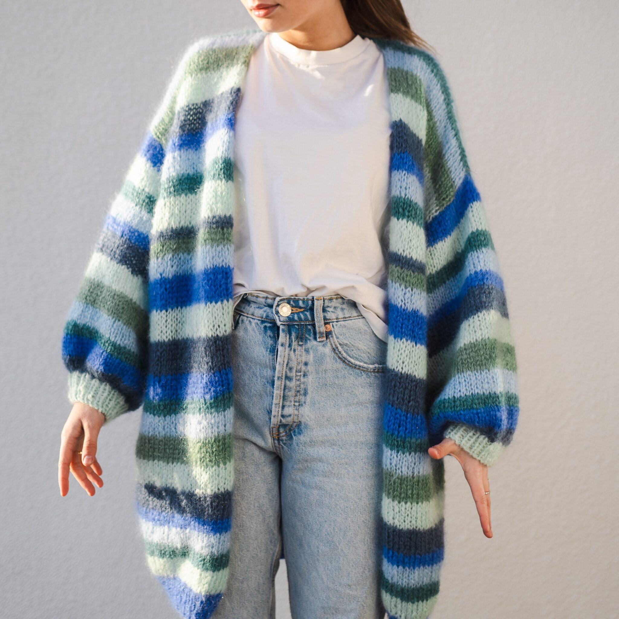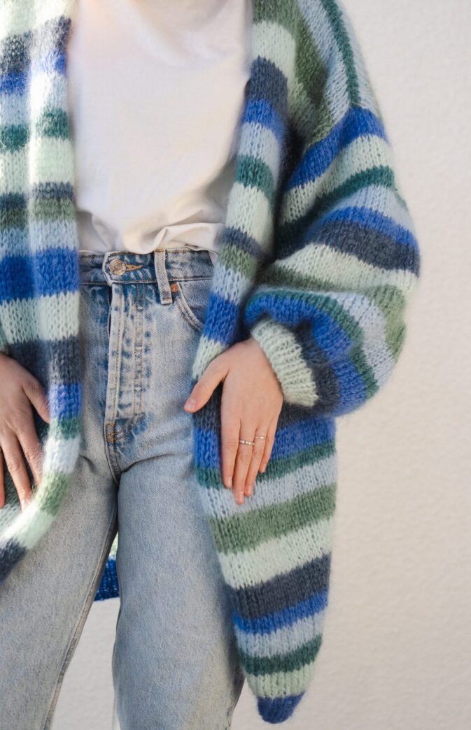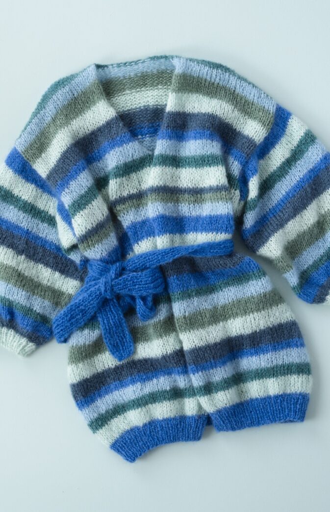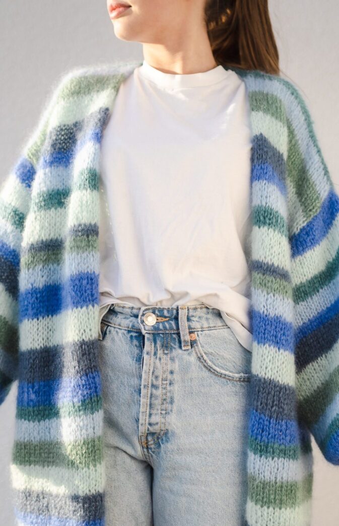 Strikkepakke med garn og gratis digital strikkeoppskrift. Stripejakke i mohair. Paradisjakken med striper- en deilig stor, fluffy og skikkelig kosete jakke. Enkel strikkeoppskrift for strikkejakke med striper.