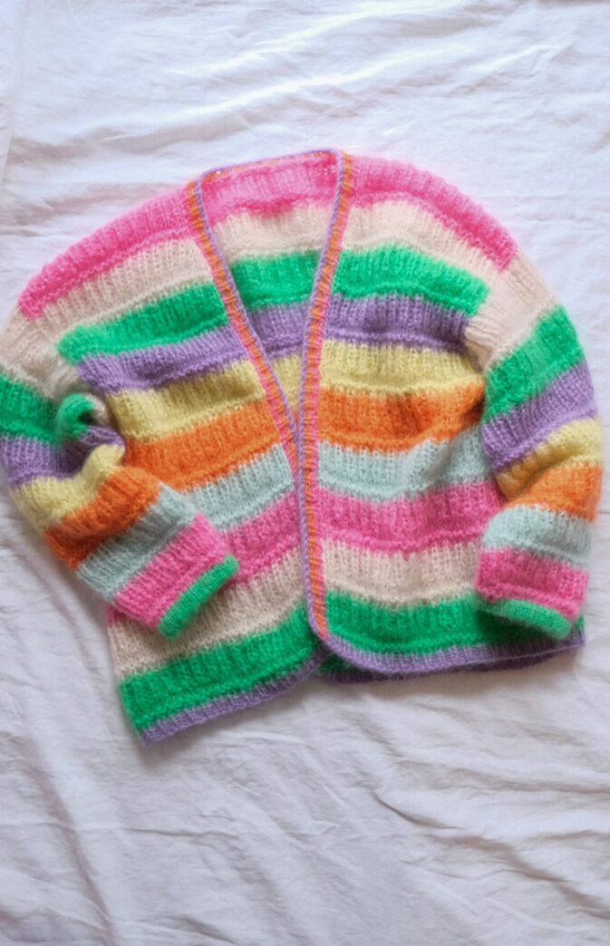 Strikkepakke med garn og gratis digital strikkeoppskrift. Myk og deilig jakke i Fluff Mohair. Jakken strikkes ovenfra og ned, noe som gjør det enklere å tilpasse lengden på ermer og bol underveis. Først strikkes for- og bakstykket hver for seg, frem og tilbake. Når ermeåpningen er ferdig settes stykkene sammen på en pinne og strikkes videre nedover bol, frem og tilbake. Ermene strikkes ovenfra og ned, ved å strikke opp masker i ermeåpning