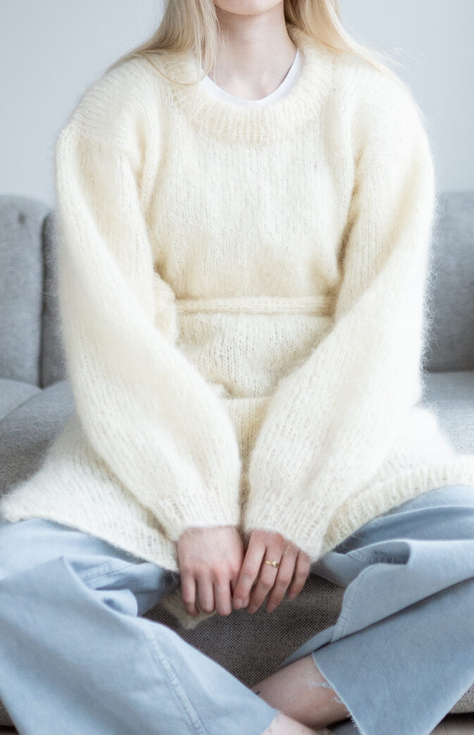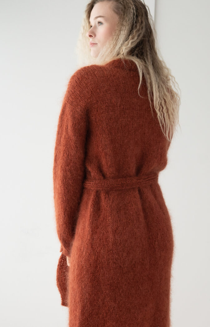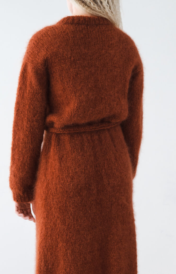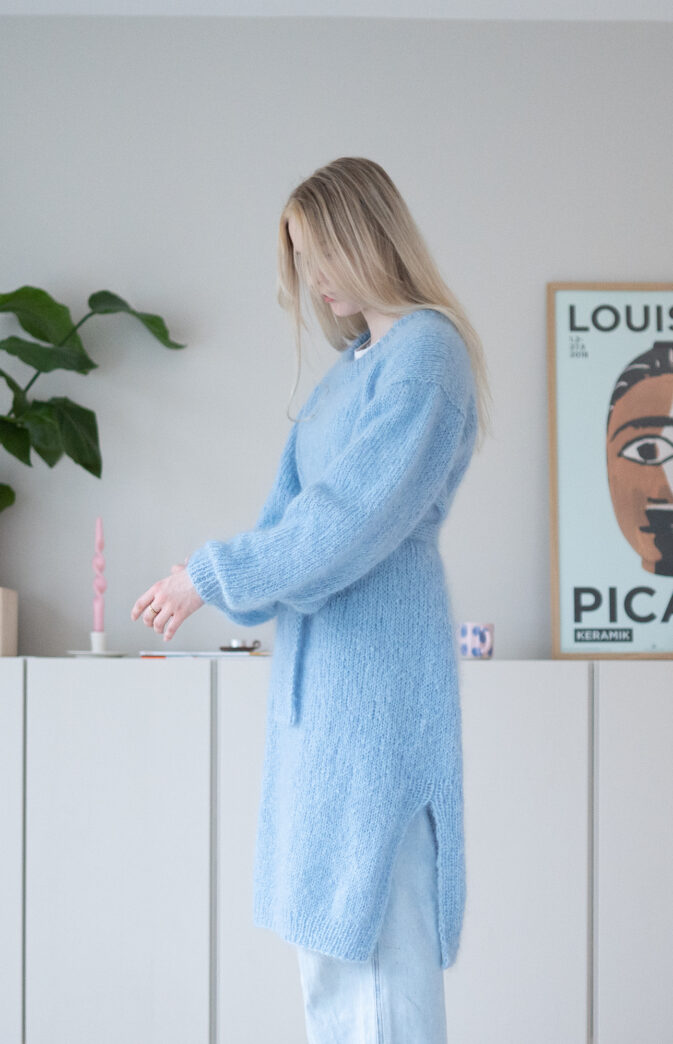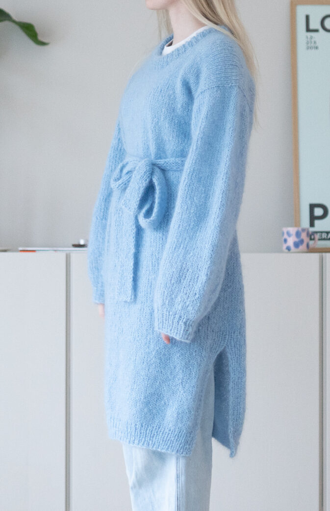 Strikkepakke med garn og gratis digital strikkeoppskrift. Strikkeoppskrift strikket kjole i mohair. Fluffy lang strikkekjole. Strikkes ovenfra og ned. Belte og splitt i sidene.