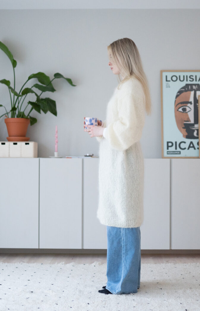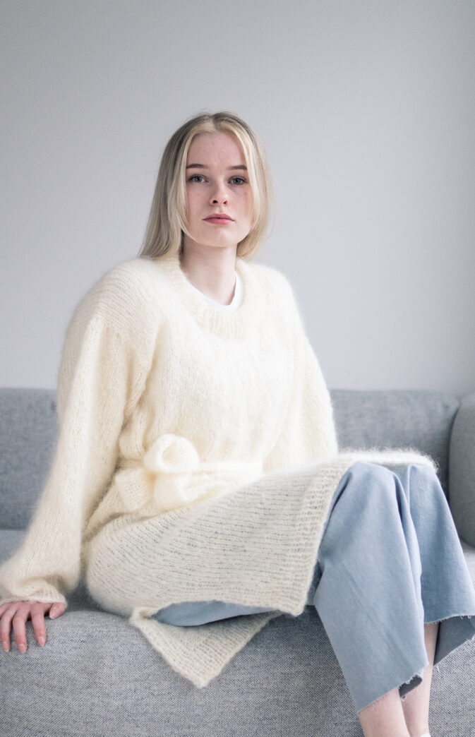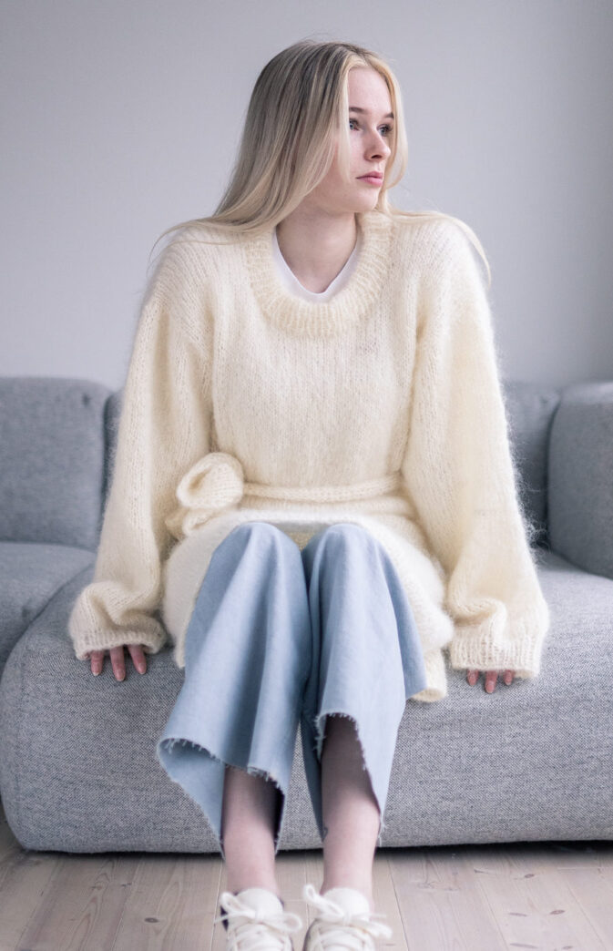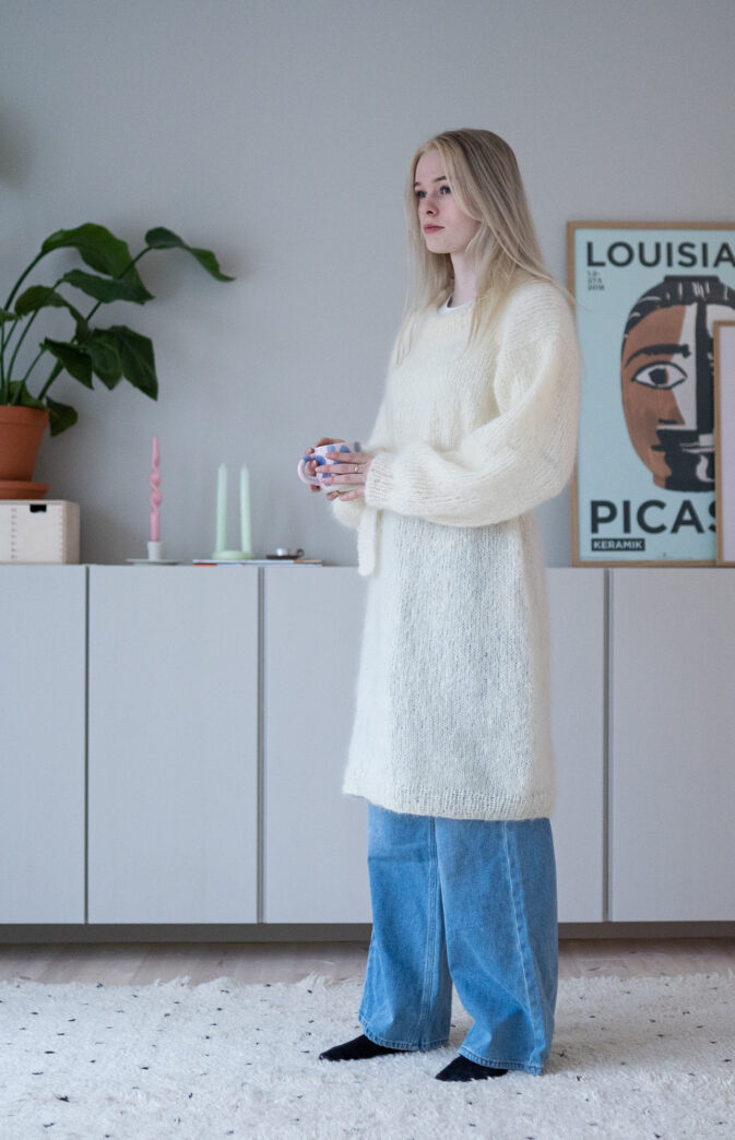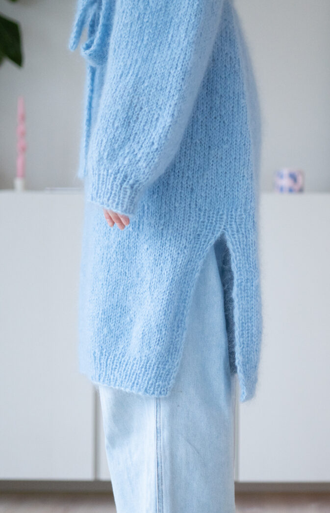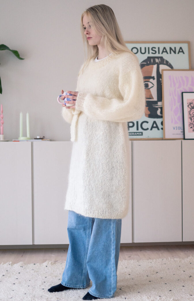 Strikkepakke med garn og gratis digital strikkeoppskrift. Strikkeoppskrift strikket kjole i mohair. Fluffy lang strikkekjole. Strikkes ovenfra og ned. Belte og splitt i sidene.