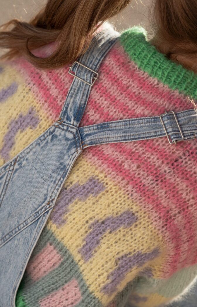 Strikkepakke med garn og gratis digital strikkeoppskrift. Fargerik strikkegenser i 80talls stil! Candyfloss genser med rund hals. Genser er lik vår originale men her har vi laget med rund hals istedenfor V-hals, samt med striper rygg. Strikkes nedenfra og opp i en tråd Fluff. Ermer strikkes ovenfra og ned, ved å strikke opp masker i åpningen på bol.