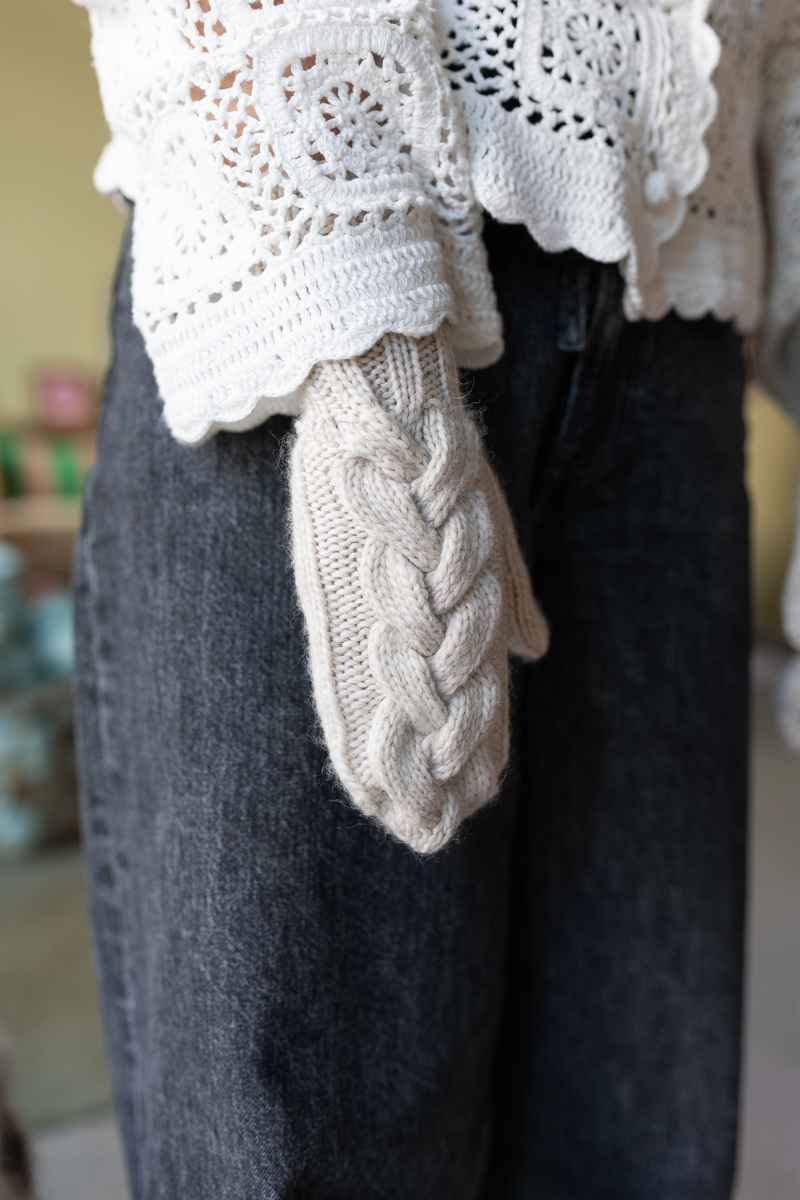 Deilige varme votter i Hip Wool med fin bred flette over hele. Fletten er lik som på vår Alba genser og har derfor fått samme navn.