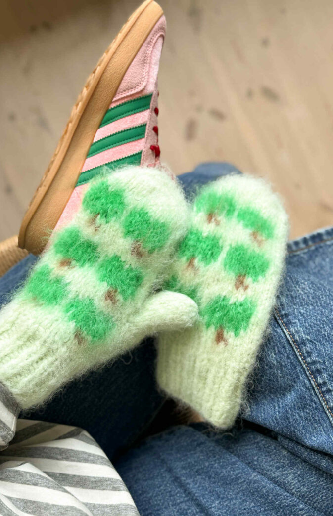 Avbildet i lys grønn BonBon «My heart is set on you», epler i Fluff «Jelly bean», stilk Fluff «Nougat». Nøytrale votter i BonBon «Stand by me», epler i Fluff «Forest green» og stilk i Fluff «Nougat»