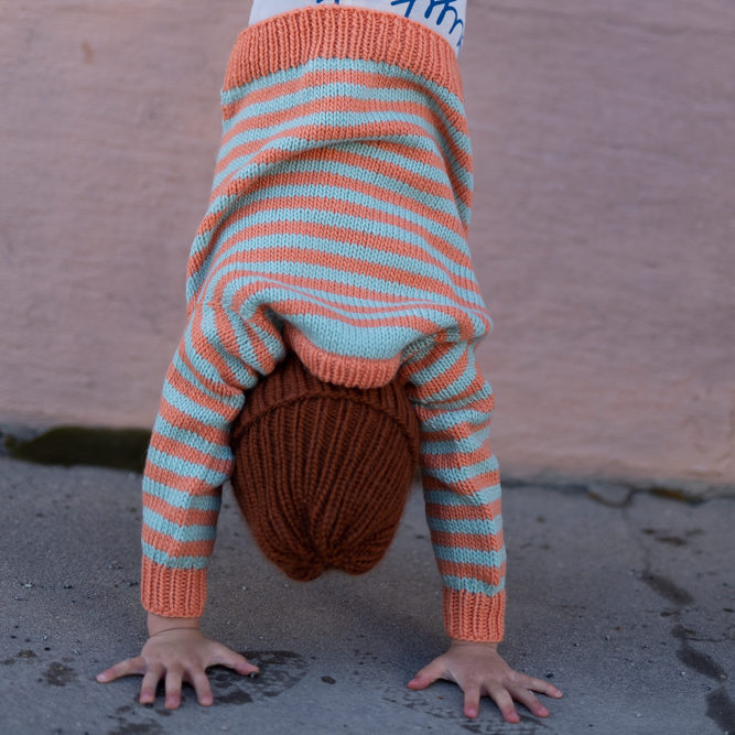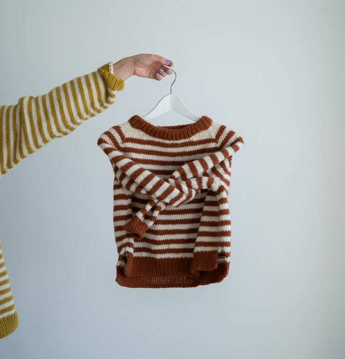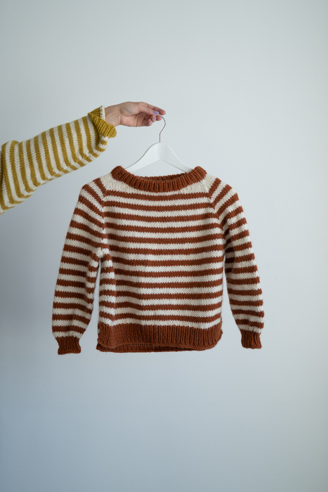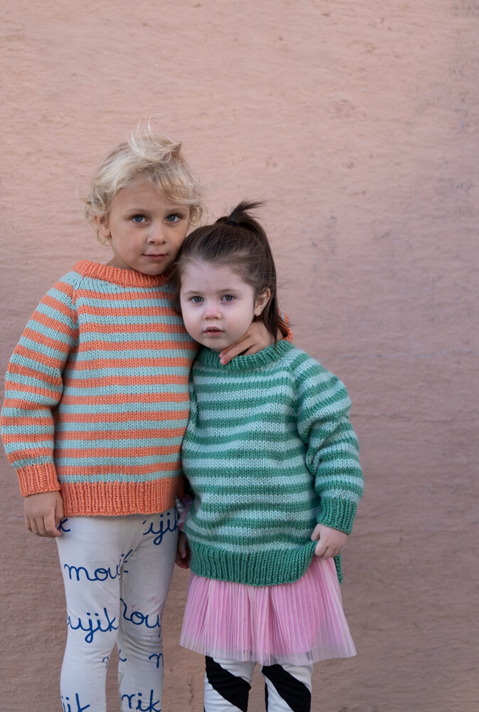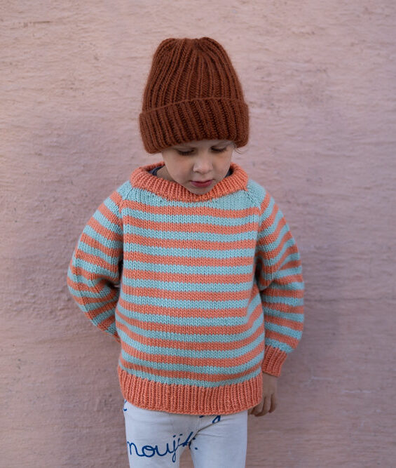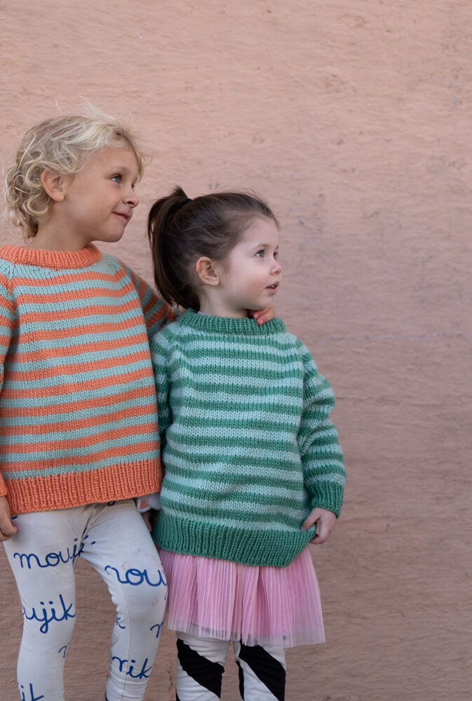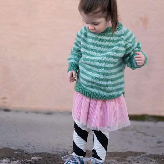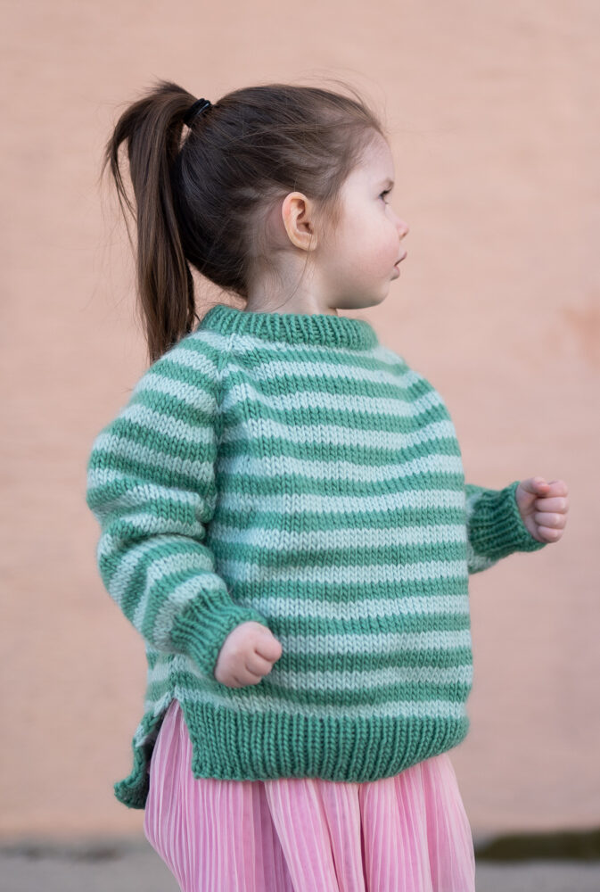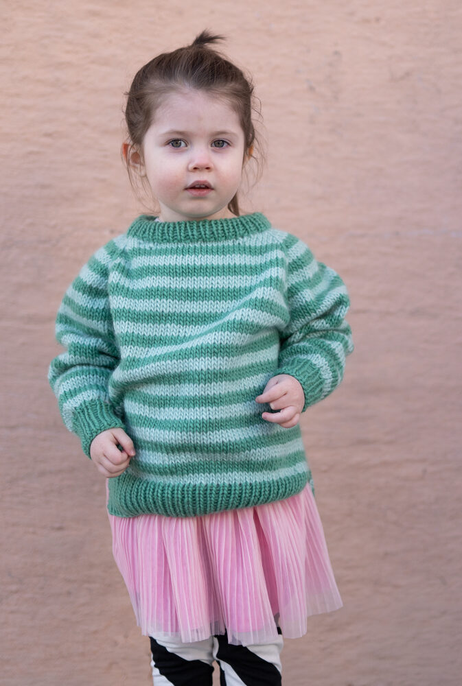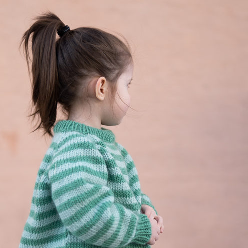 Strikkepakke med garn og gratis digital strikkeoppskrift. Strikkeoppskrift på enkel stripegenser til barn. Strikkes ovenfra og ned med raglanøkning. Splitt i siden, litt lengre bak. Romslig passform.