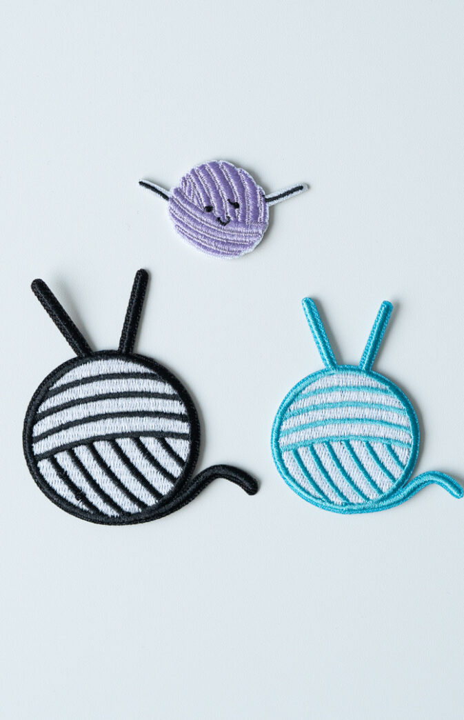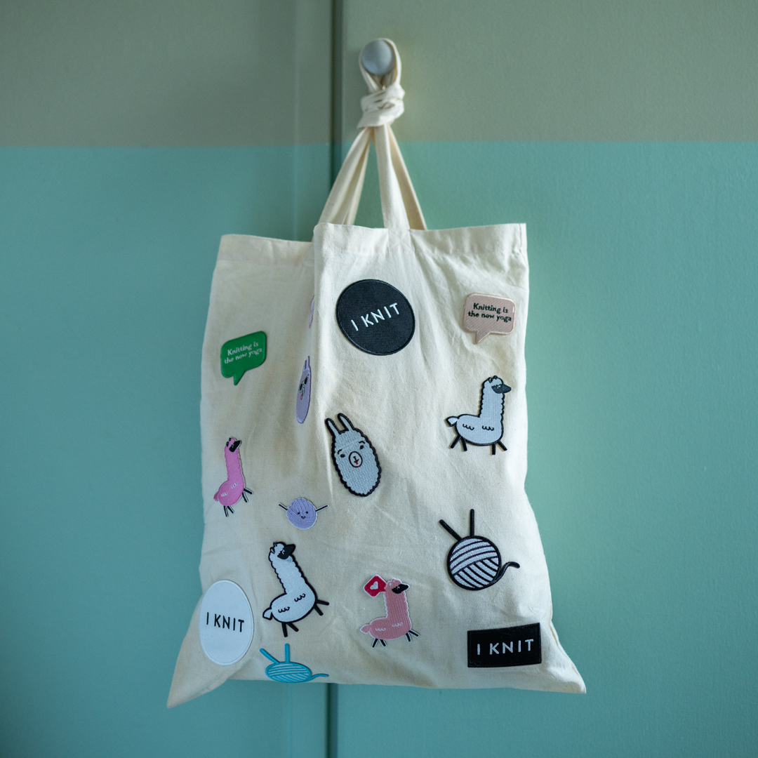 Strykemerker sett. Alle design og bomullsnett inkludert. 14 forskjellige strykemerker. HipKnitshop logo på den ene siden av tøynettet.