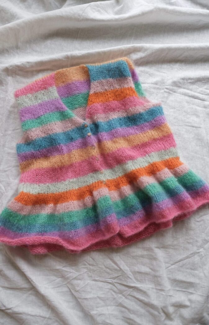 Strikkes ovenfra og ned i Fluff Mohair. Du starter med bakstykket. Når ermeåpning er ferdig strikkes forstykker hver for seg. Forstykker og bakstykket strikkes så sammen og strikkes videre ned til jakke / vest er ferdig, med volngkant nederst for en fin og feminin fasong.