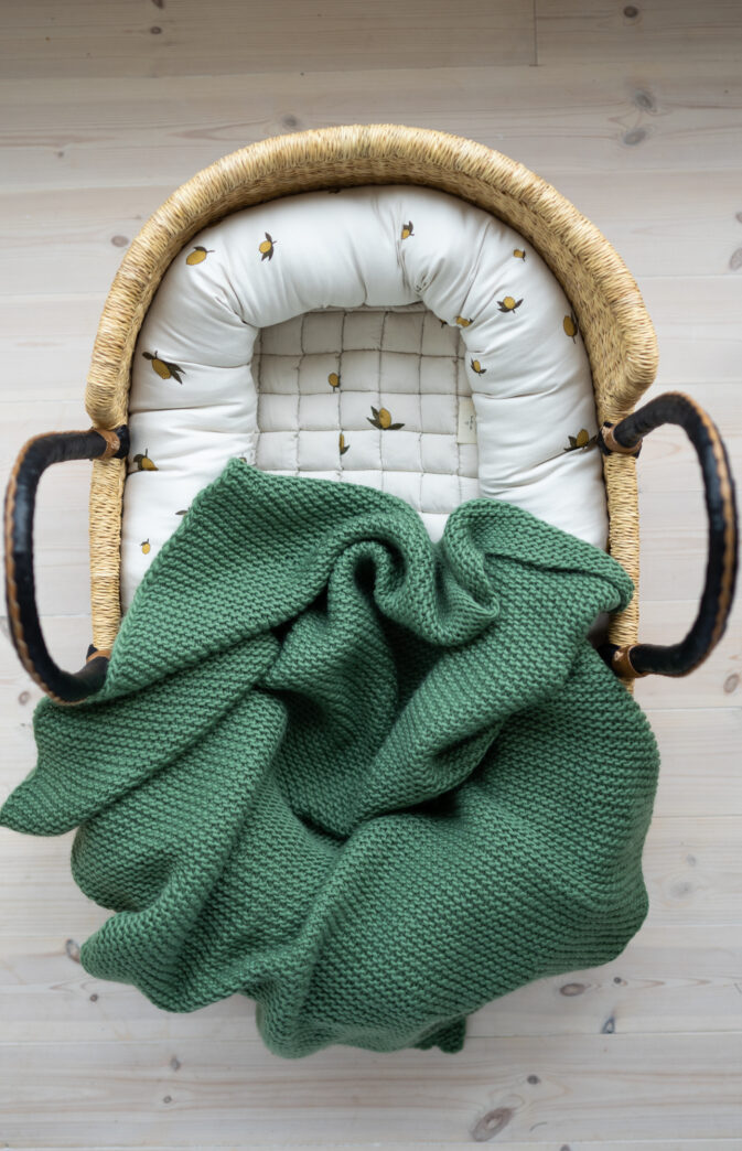 Strikkepakke med garn og gratis digital strikkeoppskrift. Superenkelt babyteppe i rillestrikk. Varmt og fint teppe til baby og små.