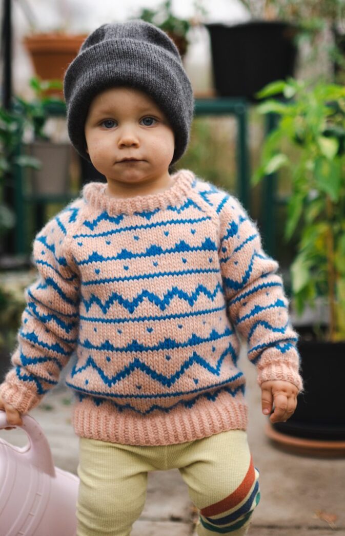 Avbildet i Hip Wool "Just Peachy" mønsterfarge "Falling for You blue" str 2 år på gutt 1 år og 4 månder