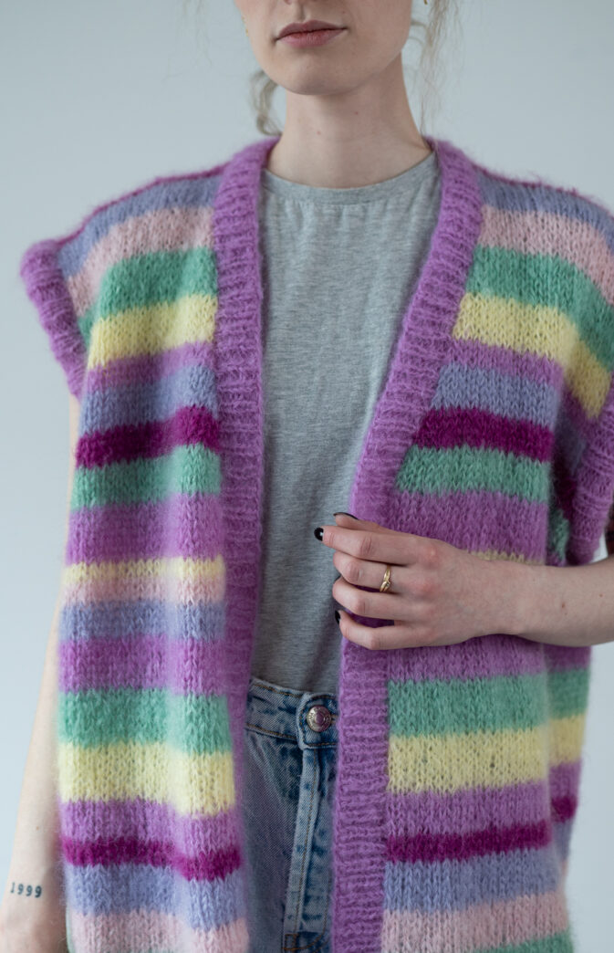 Strikkepakke med garn og gratis digital strikkeoppskrift. En enkel åpen lang vest i digge farger! Vi har strikket vår fine Paradisjakke om til en digg vest i lang lengde. Deilig, varm og kul! Like fin til sommerkjoler som til jeans. Strikkes nedenfra og opp, frem og tilbake. Raskt strikk på store pinner perfekt for å kombinere masse gøye farger – og ikke minst til restegarnsstrikk! Lek deg med farger og kombinasjoner, eller strikk i samme farger som vi har avbildet her.