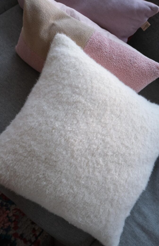 Strikkes rundt i omgang. Du legger inn innleggspute og syr pent igjen når ferdig. Du trenger også Innleggspute 30 x 30 cm for liten pute, 50 x 50 cm for stor variant