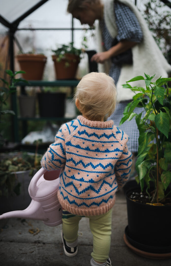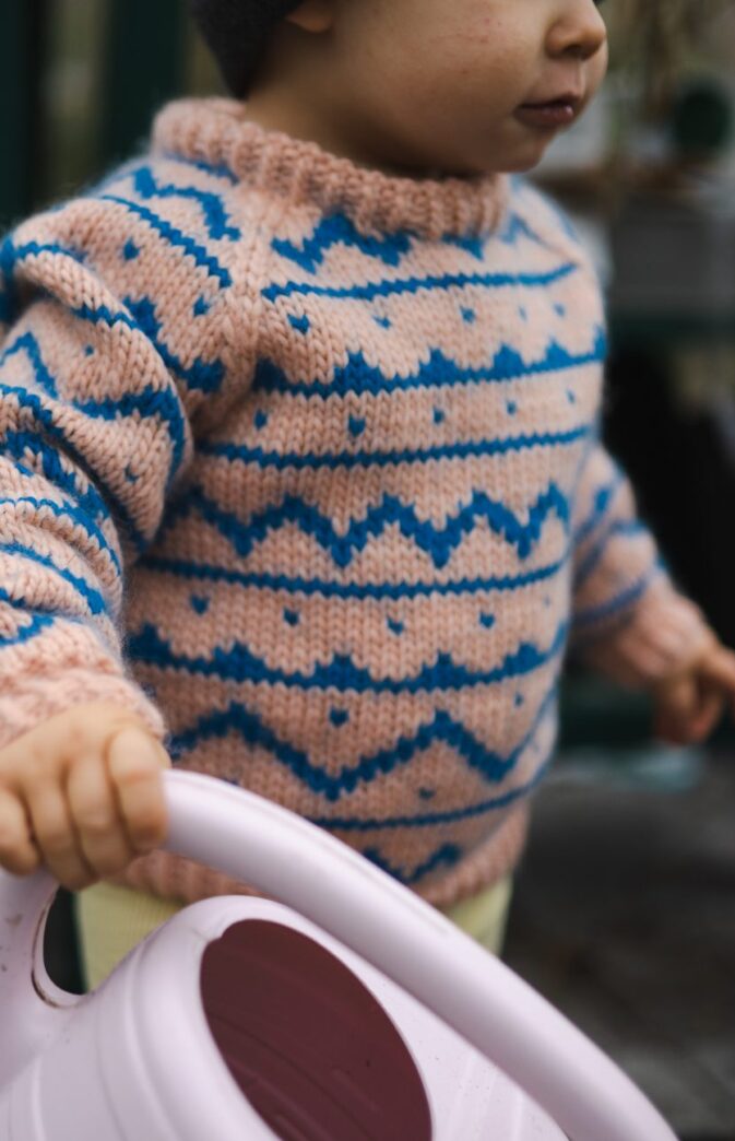 Strikkepakke med garn og gratis digital strikkeoppskrift. Strikkegenser med mønster til barn. Nydelig genser  med enkelt mønster som passer fint for nybegynnere på mønsterstrikk. Velg mellom 1 eller flere farger på mønster.