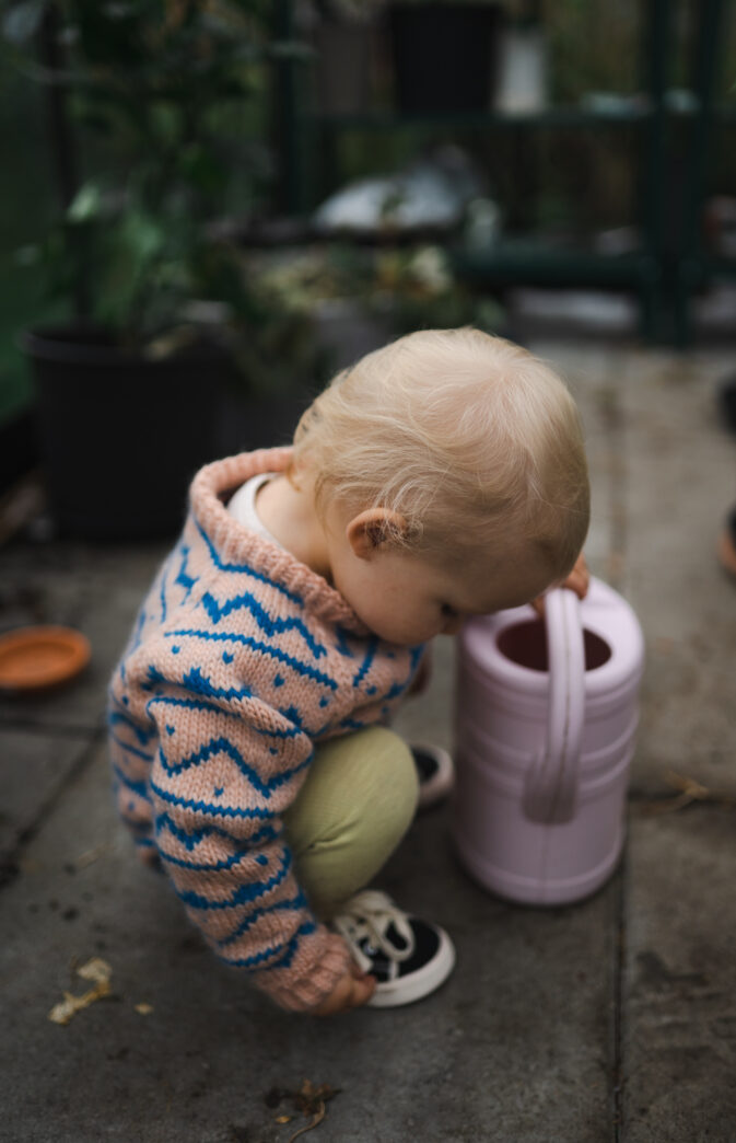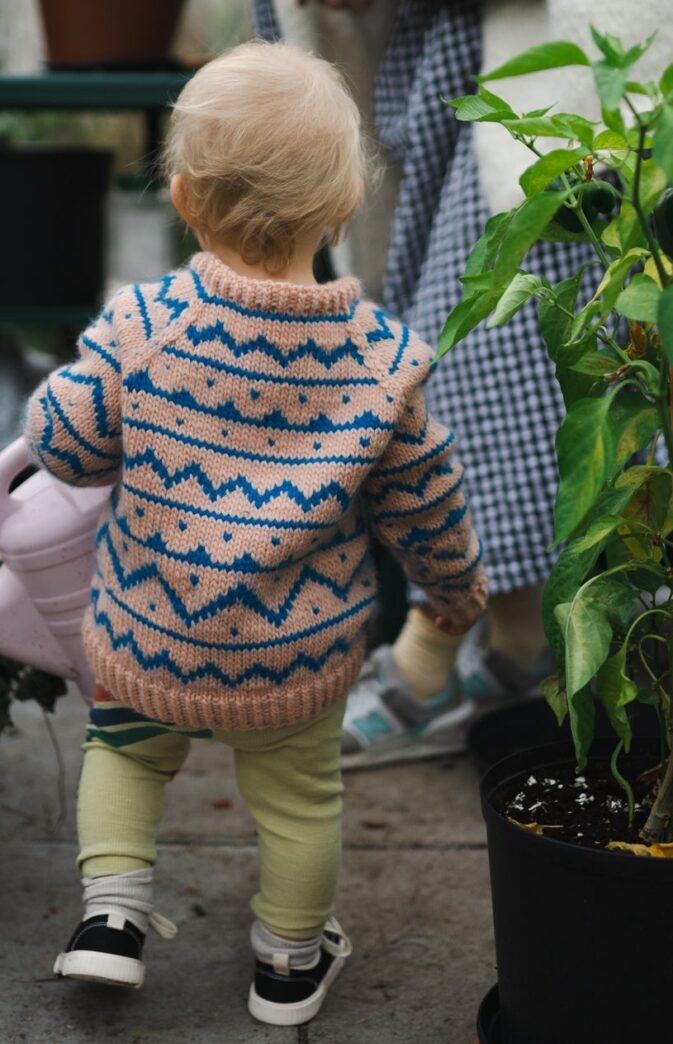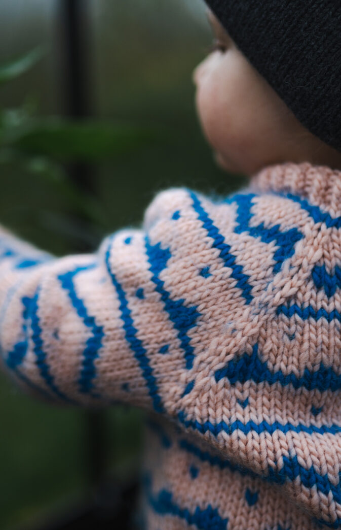 Avbildet i Hip Wool "Just Peachy" mønsterfarge "Falling for You blue" str 2 år på gutt 1 år og 4 månder